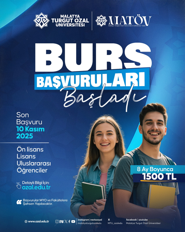 Malatya Turgut Özal Üniversitesi Geliştirme Vakfı tarafından maddi yardıma ihtiyaç duyan öğrencilerimize 2025-2026 eğitim ve öğretim yılında 8 ay süresince aylık 1.500 TL olmak üzere burs desteği sağlanacaktır. Burs başvuruları 1-10 Kasım 2025 tarihleri arasında olup, başvurular bizzat eğitim görülen okullara yapılacaktır. Başvuru esnasında Burs Başvuru Formu (Kalite Koordinatörlüğü ...