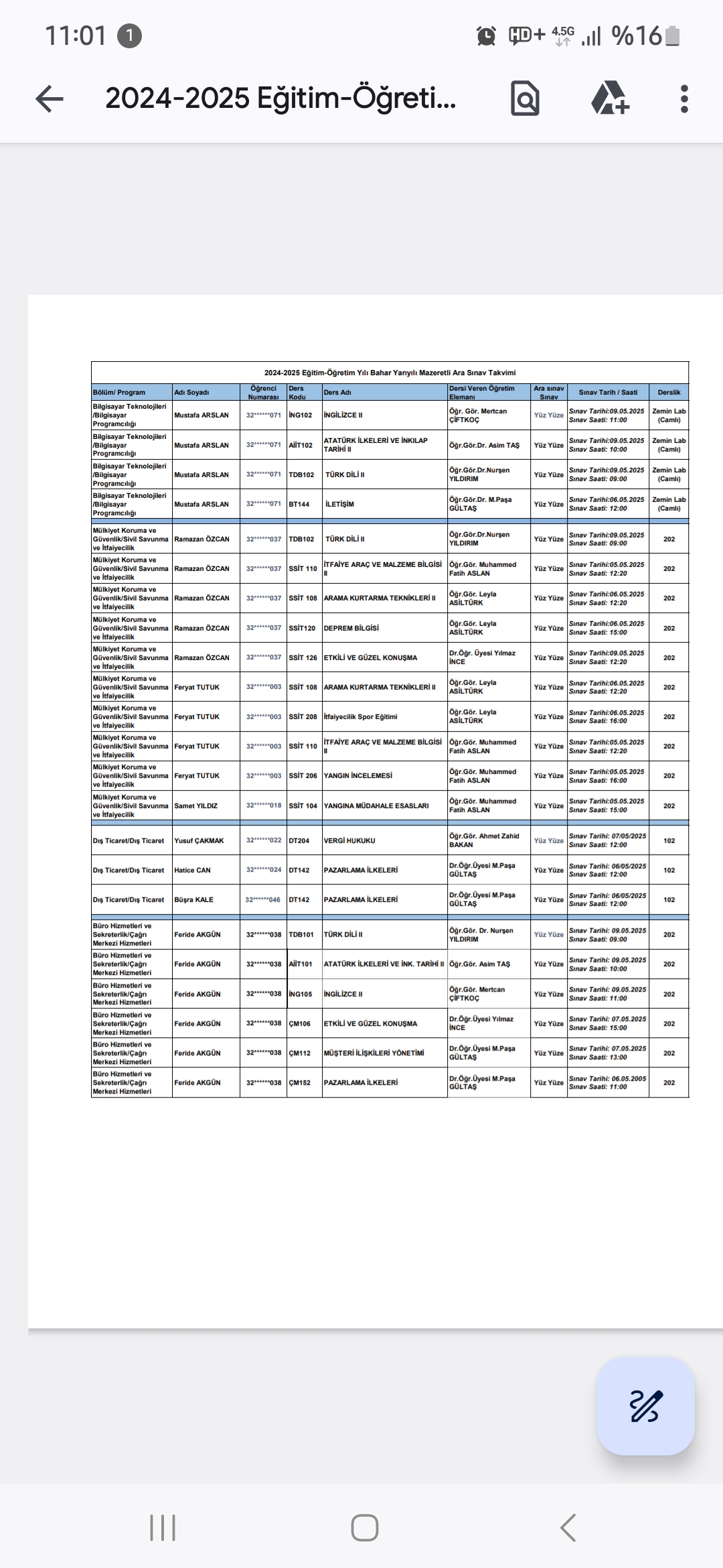 2024-2025 Bahar Yarıyılı Mazeretli Ara Sınav Takvimi