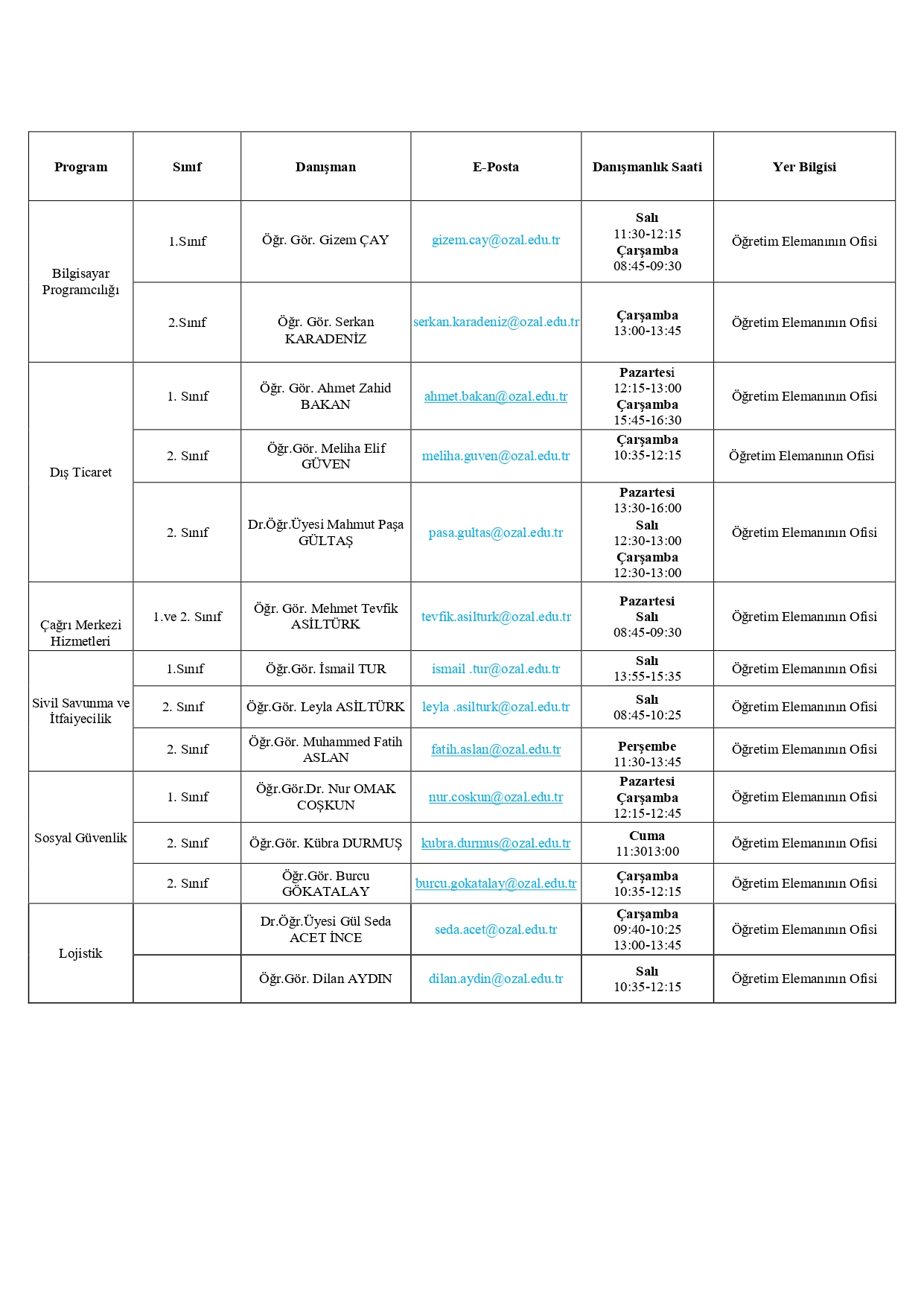 2025-2026 Güz Dönemi Ders Programı
